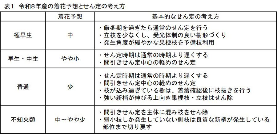 令和8年産の着花は、極早生では中、早生温州・中生温州ではやや少、普通温州では少、不知火類では中~やや少と予想されています。そのため、せん定は、表1の基本的な考え方を基に実施します。