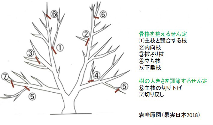 花が少ないと見込まれる樹では、せん定時期を遅らせ、軽めにせん定とするとともに、果梗枝の整理(特に上向き果梗枝のせん徐)を行いましょう。