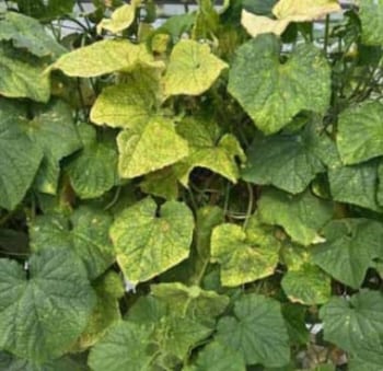 退緑黄化病はウリ類退緑黄化ウイルス(CCYV)によって引き起こされるウイルス病です。CCYVはタバココナジラミQ及びBタイプによって伝搬され、汁液伝染、土壌伝染、種子伝染はしません。感染したキュウリは、葉に退緑小斑点が現れ、その後、葉全体が黄化します(写真1)。