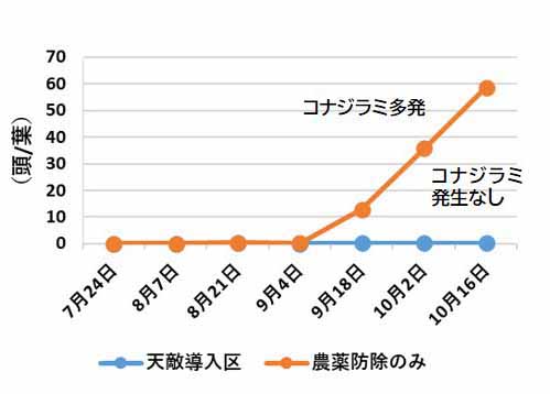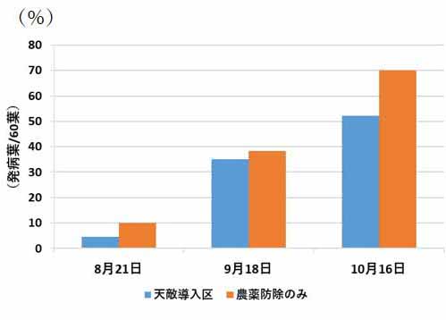 また上記2種の天敵を導入したほ場では、天敵を導入しなかったほ場に比べて、害虫の密度を抑制することができ、それに伴いウイルス病の発生低下が確認されました(図1、図2)。