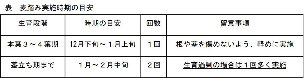 なお、茎立ち期以降の麦踏みは、茎や地表に出た幼穂を傷つけ減収に繋がるため、図を参考に作業を中止する判断も必要になります。