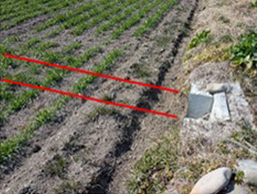 写真1のように、額縁明きょを設置しても、枕地が排水口を塞いでいる場合は、ほ場内の排水が速やかに行われませんので、枕地を横断して排水溝を設置します。