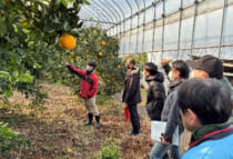 芦北地域では関係機関で「新たな担い手確保対策プロジェクトチーム(以下PT)」を構成し、減少する地域の担い手確保に向けた取組を積極的に行っています。例年就農を希望する方々を対象にバスツアーを計画しており、本年は県内外から4名が参加して12月6日(土)に開催しました。このツアーでは、現地での栽培状況をはじめ、認定研修機関(JAあしきた)での研修紹介や就農に必要な情報提供を行い、地域の魅力や果樹農業の実際を知ってもらうことを目的としています。