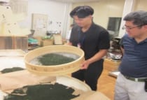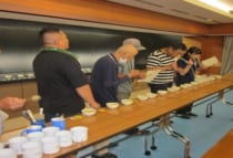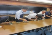 8月7日に茶業研究所において、上益城地域のお茶を持ち寄り、評価や意見交換を行う求評会を開催しました。求評会で使った荒茶は、今年度の熊本県茶品評会(荒茶の部)の審査で使われた荒茶を使用し、出品者のみならず、茶の品質向上を図るための研修の位置づけで、茶生産者、関係者合計で20人が参加しました。求評の方法は外観、香気、水色、滋味の順で評価検討を行い、県品審査結果の順に並べたお茶を各自評価する方法で行いました。参加者には今年度県品の結果(上位者のみを記載)を配布し、また出品者には自分の審査番号だけを個別に配布しました。