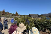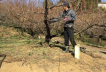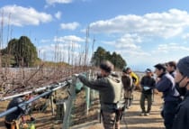 講習会では、まず座学でカイガラムシの防除に係る指導を行い、その後の現地では今年産の着果予想踏まえたせん定のポイントについて、実践を交えて指導しました。今季は厳寒期の少雨・乾燥の影響により樹体に強いストレスがかかっているため、間引きせん定を中心とした“軽めのせん定”をポイントとし、周知を図りました。
