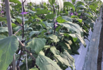 10月7日に南関町の(農)よなだがナス栽培ほ場に地元南関第四小学校2年生9人とその保護者、教師を招いて収穫体験イベントを開催しました。当課は、企画・準備から実施までの活動を支援しました。