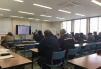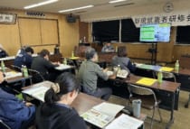 荒尾市、JAたまな及び玉名地域振興局では、毎月定例会を実施し、経営安定・産地維持に向けた対策の検討を行っています。今年は、荒尾市内生産者全87戸に対面での聞き取り調査を実施しました。調査により、栽培面積や品種構成の現状が明らかになったとともに、経営の実情、将来の経営意向について、農家の生の声をすくいあげることができました。この調査をもとに、1月27日に全体研修会を開催しました。当課から、ナシ経営の健全化・安定を目指して、「甘太」「凛夏」を軸とした新たな品種構成や「あきづき」等の品種特性に合わせた栽培方法の見直しを提案しました。
