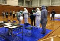 その後、隣の不知火体育館へ場所を移し、実際と同じレイアウトで各ゾーンに分け、受入れから送り出しまで運営側の業務の流れと応援者の動線等について確認を行いました。また、宇城保健所の指導の下、防疫服の着脱訓練も併せて実施しました。実際と同じ人と時間の流れを確認しながら訓練することで、運営スタッフとなる職員も、それぞれの役割について、より理解を深めることができました。