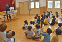 当課では11月上旬に八代管内の抽選で選ばれた3園において、みかん配布と併せて「みかんがどのようにできるのか」「みかんを食べるメリット」等を分かりやすく理解できるよう、簡単な紙芝居を用いて説明を行い、温州みかんの魅力を伝えました。当日は多くの園児や先生方にご覧いただき、温州みかんへの興味を深めてもらうことができました。