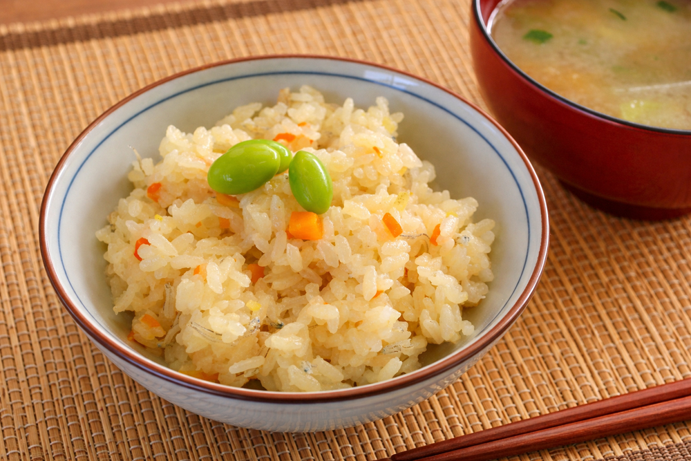 ⑷炊飯器にこんぶ、米、もち米、人参、ちりめんじゃこ、晩柑の皮、混ぜ合わせた調味料を入れて炊飯する。